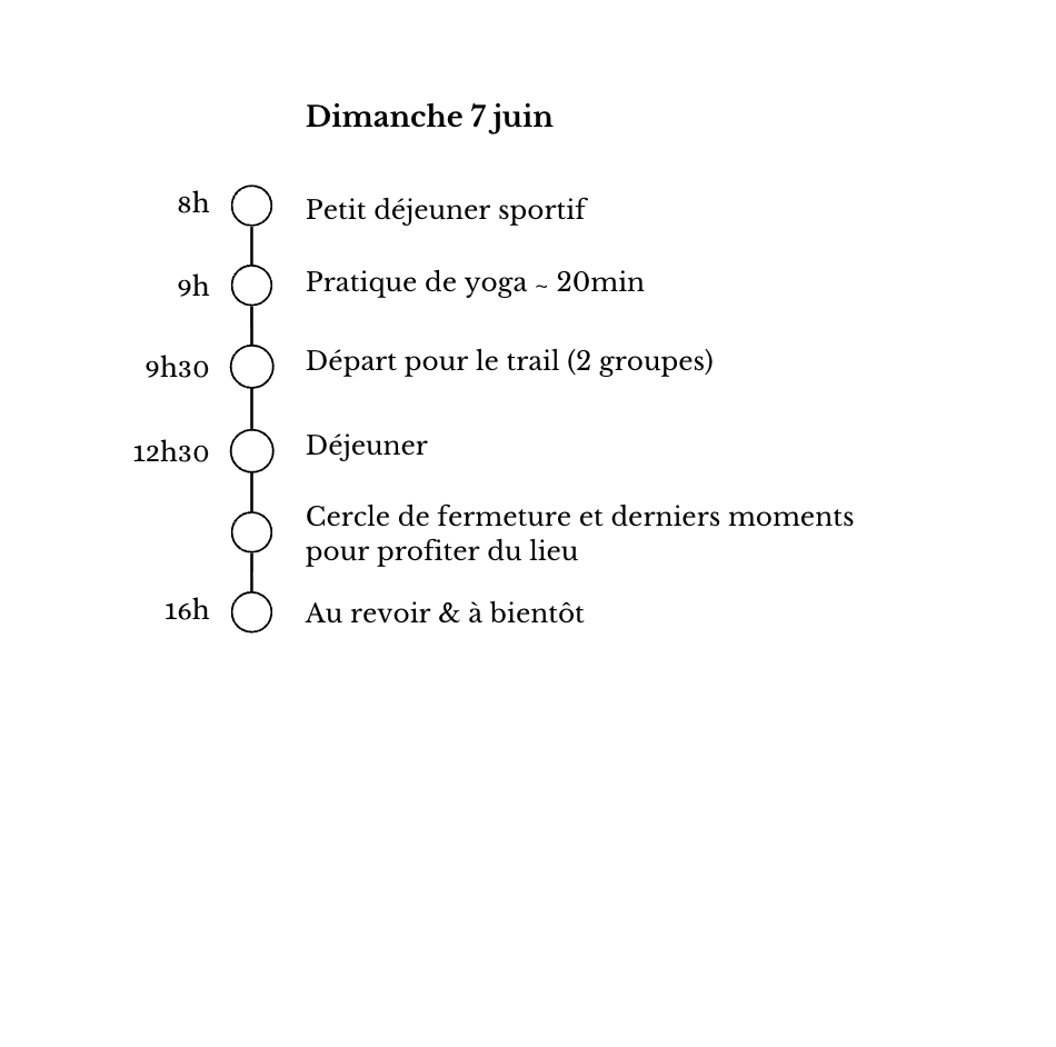 Nous vous enverrons une check list à quelques semaines de la retraite. Mais vous pouvez penser à prévoir : chaussures de trail, tapis de yoga, tenue pour le trail et le yoga, plaid, flasques, votre alimentation pour courir si besoin…